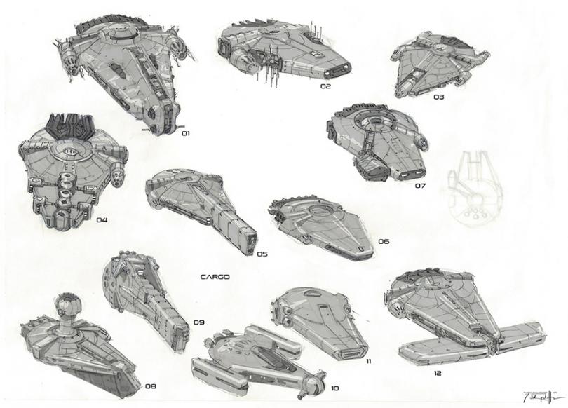 Après une multitude de designs, James Clyne et son équipe sont finalement revenus à un profil plus classique, se rapprochant plus de ce que les fans ont connu. "Nous avons imaginé tous les croquis possibles et imaginables", reprend James Clyne. "Au final on est revenu à un concept de Ralph McQuarrie (concepteur originel du Faucon Millenium, ndlr) car il était le plus épuré. Nous avons donc fait marche arrière et regardé tout ce que Ralph McQuarrie avait fait ».