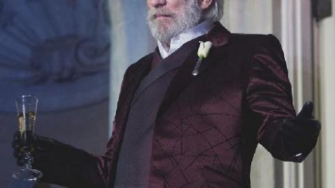 Le gentil président Snow (Donald Sutherland) félicite ses ouailles de lui avoir permis de prolonger son mandat de 50 ans