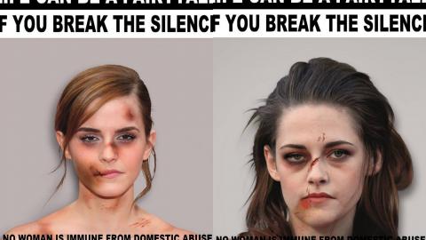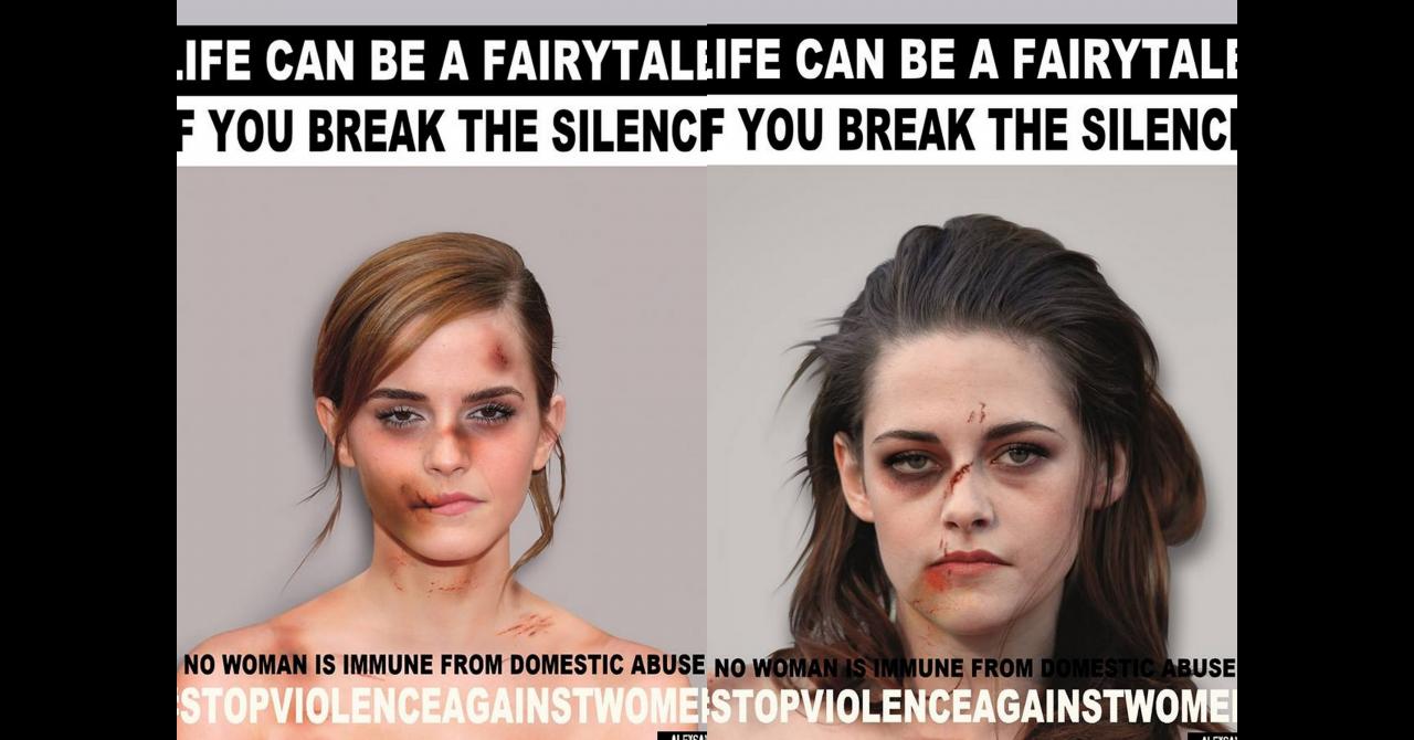 Ainsi, le visage meurtri et le cou étranglé, on découvre sous le slogan "La vie peut être un conte de fées si tu brises le silence. Pas une femme n'est immunisée contre la violence conjugale. #stopalaviolencecontrelesfemmes", les portraits d'Angelina Jolie, Emma Watson, Madonna, Miley Cyrus, Kristen Stewart, Kim Kardashian, Gwyneth Paltrow et Kendall Jenner, victimes des coups.