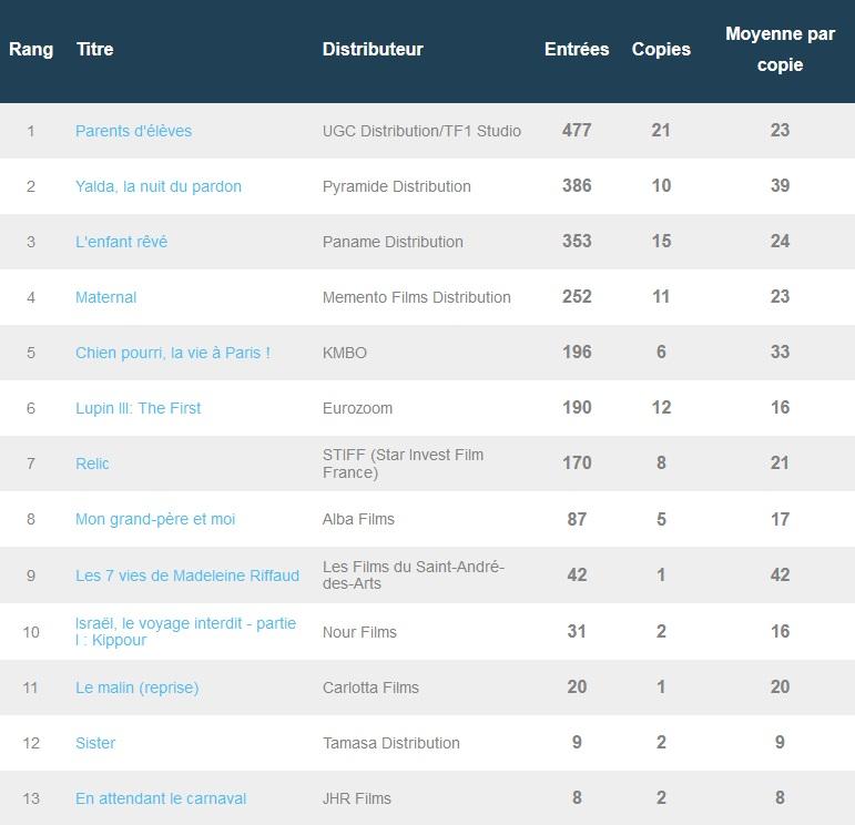Les premières séances étaient très faibles, ce mercredi dans la capitale. Sur 13 nouveautés, aucune n'a franchi les 500 entrées. Parents d'élèves, comédie de Noémie Saglio menée par Camélia Jordana et Vincent Dedienne, est ainsi en tête avec seulement 477 billets vendus dans 21 cinémas. On retrouve ensuite Yalda, la nuit du pardon, et L'Enfant rêvé, au-delà des 300 tickets, puis Maternal est quatrième pour seulement 252 contremarques écoulées sur 11 copies, et l'adaptation de la série animée Chien pourri boucle le top 5 avec moins de 200 tickets. C'est tout de même assez pour doubler Lupin III : The First, autre projet animé qui avait pourtant obtenu de bonnes critiques dans la presse.